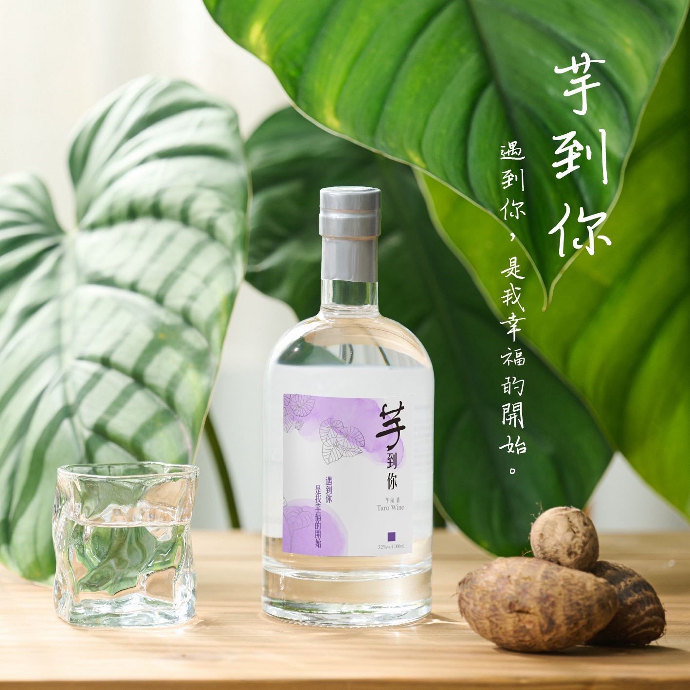 芋到你 芋頭酒 Slogan:芋到你 是我幸福的開始 喝的不是酒而是一種情緒,用簡短一句話陪你走一生。 把台灣芋頭的香,釀成一口溫柔的微醺。 「芋到你」選用台中大甲檳榔心芋頭為原料,以細緻工法釀製,完整保留芋頭獨有的綿密芋香與淡淡奶甜感。入口滑順不膩、香氣層次柔和,32% 酒精濃度帶來更立體的香氣延伸與乾淨尾韻,適合純飲慢品,也很適合做成微醺特調。 不論是節慶送禮、朋友聚會或晚餐後的小酌時光,「芋到你」都能讓日常多一點療癒、多一點幸福。 規格:酒精濃度 **32%**|容量 100ML,500ML 原料:台中大甲檳榔心芋頭 風味特色:濃郁芋香|柔甜不膩|口感滑順|尾韻清爽 飲用建議:冰鎮純飲最佳;可氣泡水更清爽,也可搭配蜂蜜、奶香系風味做調酒。
