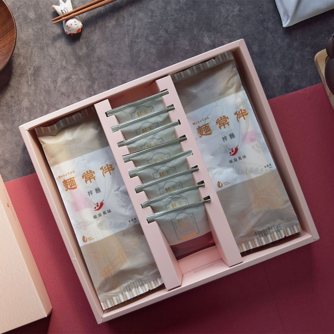 ✦ 「饌禮盒」從台中出發的職人滋味 饌禮盒以「台中在地製麵工藝」為核心,由 麵常伴 傳承超過 30 年的製麵經驗打造。堅持台中在地生產,將時間、手感與技術揉進每一條麵中,呈現台灣人熟悉卻不平凡的日常美味。 ✦ Q 彈久煮不爛,成就經典椒麻風味 麵條採用改良後的台灣乾直麵製法,口感 Q 彈、有勁,久煮不軟爛。搭配濃郁麻醬與花椒香氣交織的椒麻風味,香而不膩、辣而回甘,冷拌或熱食都適合,完美呼應台灣氣候與飲食習慣。 ✦ 一麵一茶,平衡最剛好 禮盒搭配「日月潭之舞紅茶」三角茶包,選用台灣代表性紅茶—台茶18號,自然肉桂與薄荷香氣,茶韻溫潤回甘,恰好中和椒麻的濃厚滋味,讓整體風味更有層次。 ✦ 台中在地 × 台灣風土的最佳禮選 從台中職人手藝出發,串聯台灣代表性農產,饌禮盒不只是美食組合,更是一份承載在地文化與心意的伴手好禮。