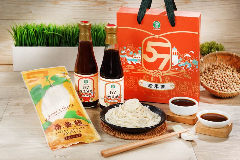 「57珍禾禮」由臺中市梧棲區農會推出,是展現梧棲風土與在地農產特色的代表性伴手禮。「57」源自「梧棲」的諧音,「珍禾禮」則取自閩南語「真好禮」,象徵真材實料與誠意用心,是最具台中特色、最值得分享的伴手好禮。 禮盒內容包括三款熱銷產品:57米豆油、57米豆油膏與57番薯麵。 其中,57米豆油以糙米與整顆黃豆製成,不含小麥,較適合對小麥麩質敏感的族群。57米豆油膏無修飾澱粉使黏稠度較為自然,57米豆油膏較不黏稠,維持古早傳統的口感,是自然又好吃的安心醬料。 57番薯麵則以地瓜為主要原料,富含多種營養,由老師傅以傳統手工製作,口感樸實香醇。