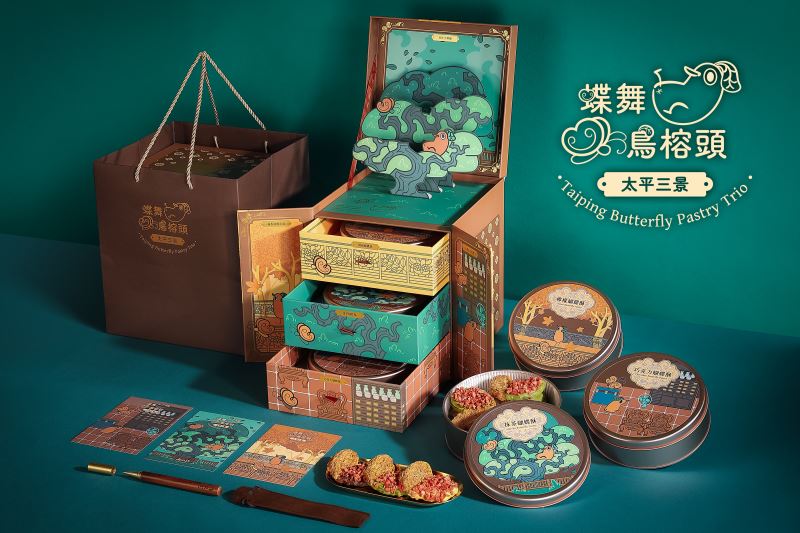 《禮盒名稱》湳得金匱 | 醬燒燕麥曲奇 一份跨越山城時空的黃金心意 退役後的水湳機場,華麗轉身成為了臺中之肺-中央公園,成為臺中市的新地標,「螞蟻來了」阿國師傅帶著家鄉的黃金味道,投入烘焙業三十年熟成的職人歲月,跨越竹山到水湳這片充滿人文風韻的土地上札根,承載著歷史時空繼續陪伴台中人「起飛」 《研發動機》 一份來自土地的愛,讓養生變得更美味。 【源自土地的守護】 來自南投竹山茶農世家的紅薑黃,由母親親手栽種、手工刷洗、日曬研磨,將辛香濃烈轉化為守護全家人的心意。 【職人工藝的挑戰】 為了讓這份珍貴的「養生瑰寶」更平易近人,阿國師傅歷經多年試煉,成功將薑黃融入曲奇與蛋糕,轉化為溫潤順口的美味。 【蟬聯金獎的肯定】 這份堅持,讓「螞蟻來了」蟬聯 2024、2025 臺灣百大伴手禮。我們把最好的愛,封存在甜點裡,每一口都是守護。 《禮盒產品介紹》 ■ 「醬燒燕麥曲奇」 「以漢方典籍為經,用當代烘焙為緯。」 阿國師深研中醫典籍中的智慧,取漢代醫聖張仲景《金匱要略》中薑黃與肉桂的溫潤組合,巧心搭配牛奶巧克力,打造出獨一無二的「黃金三角」風味-醬燒燕麥曲奇(Turmeric Cinnamon Oat Cookies) 古法智慧|以「肉桂」溫潤的甜香,巧妙化解「紅薑黃」的濃烈辛香。 創新風味|獨家秘製「巧克力」沾醬,讓年輕族淺嚐風味,一口就愛上。 初心堅持|低糖、無添加,讓享受點心也能享受健康。 ■ 「參拚綜合曲奇」 三款經典風味曲奇 丹麥奶酥 (Danish Milk Shortbread): 經過時間粹煉的發酵奶油,散發層次醇厚的奶香,化口不膩。 竹炭可可 (Bamboo Charcoal Cocoa): 深邃的竹炭黑,融合了微苦的可可風味,口感酥鬆迷人。 伯爵奶茶 (Earl Grey Milk Tea): 伯爵茶獨有的佛手柑清香與濃郁奶油風味揉合,茶香輕盈優雅。 《禮盒設計理念》 台中中央公園, 以教育、創新和低碳的理念設計, 是一個把自然、 城市跟生活放在一起的地方。 整個公園是以魯道夫・史代納「十二感官」規劃, 從看得到的風景、聽得到的聲音, 到空氣的味道,還有走路、停下來的身體感覺。 這款禮盒,就是把這樣的體驗留下來。 外包裝結合中央公園生態物種、與感官建築的設計概念, 裡面裝的,是一片片香甜不膩的曲奇餅乾。 希望旅人離開台中時, 不只是帶走照片, 也能把台中的節奏、人文和甜味一起帶回家。 螞蟻來了,為你而甜。 《禮盒設計包含》 「城市綠肺」插畫鐵盒兩款: ■ 醬燒燕麥曲奇 | 體感建築 - 十二感官體驗區 以「十二感官建築」為主題繪製,金色的自我瞭望臺承載在台中夢想的希望,與「黃金燕麥曲奇」起飛。 ■ 參拚綜合曲奇 | 地景生態 - 動植物生態廊道 在城市綠肺的生態畫布上,物種與植栽以自然和諧的姿態群聚共生,生機盎然的融合於「參拚綜合曲奇」鐵盒之中。 「湳得金匱」 | 醬燒燕麥曲奇 | 禮盒三褶文宣一式 每片曲奇都蘊含著時間淬煉的職人技藝,品嚐「湳得金匱」禮盒,不只是味蕾的享受,更是一場在城市綠肺中漫步的感官之旅。 「水湳感官之旅」在城市的綠肺裡,找回最初的自己 | 健走書籤卡四款: 這套書籤小卡以魯道夫・史代納教育哲學規劃的十二感官建築,設計成插畫書籤,加入QR Code導覽,鼓勵每一位旅人暫離塵囂,親身走進公園,結合城市探索、哲學思維與在地美食的深度之旅。 完成感官巡禮者,寫下一句體驗心得後可至門市兌換小禮物 此設計不僅增加了旅人在臺中停留的深度與時間,更透過獨特的文化體驗,讓消費者在品嚐美味伴手禮之餘,加深台中在地特色的記憶載點。 《ESG永續包裝設計》 手提式紙盒|便攜+節省外包裝 禮盒內建提把的設計無需再額外使用紙提袋,企業送禮可選擇精緻布提袋,延長包裝壽命。 鐵盒包裝|生活收納+綠色消費 鐵盒上呈現兩款水湳在地特色插圖,具收藏價值,可重複用於生活收納,將綠色消費的文化融入日常。 《社福公益》 114年4月12日螞蟻來了甜點烘焙贊助捐血中心【膠原蛋白蜂蜜蛋糕】200條
