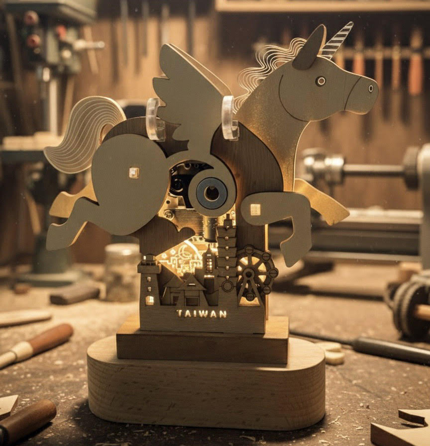 (非凡之馬,為不凡的一年而生) 馬年獨角飛馬收藏音樂盒,採用 綠色傑森原創音樂盒結構,讓獨角飛馬隨發條旋律奔跑律動,作品以木質音樂盒為核心,結合LED小夜燈與櫻桃木擴香底座,融合音樂、光影與氣味,打造一件兼具功能性與美學價值的桌上療癒收藏。 轉動背後發條,旋律緩緩流動,馬身隨節奏擺動;透過 LED 導光設計,獨角、馬鬃與馬尾同時透出柔和光影,隨動作閃耀,為空間增添溫暖層次。精油香氣隨櫻桃木溫潤擴散,讓日常在此刻慢下來。 底座造型取材自 台灣城市意象,飛天的獨角飛馬掠過微微發光的城市輪廓,城市裡的點點星光,象徵在城市中忙碌的人們,心中不曾熄滅的夢想與希望。 這不只是一件音樂盒, 更是一件融合 音樂、光、香氛與工藝美學 的收藏作品, 為日常建立儀式感,也為你的一整個不凡年份,靜靜作伴。